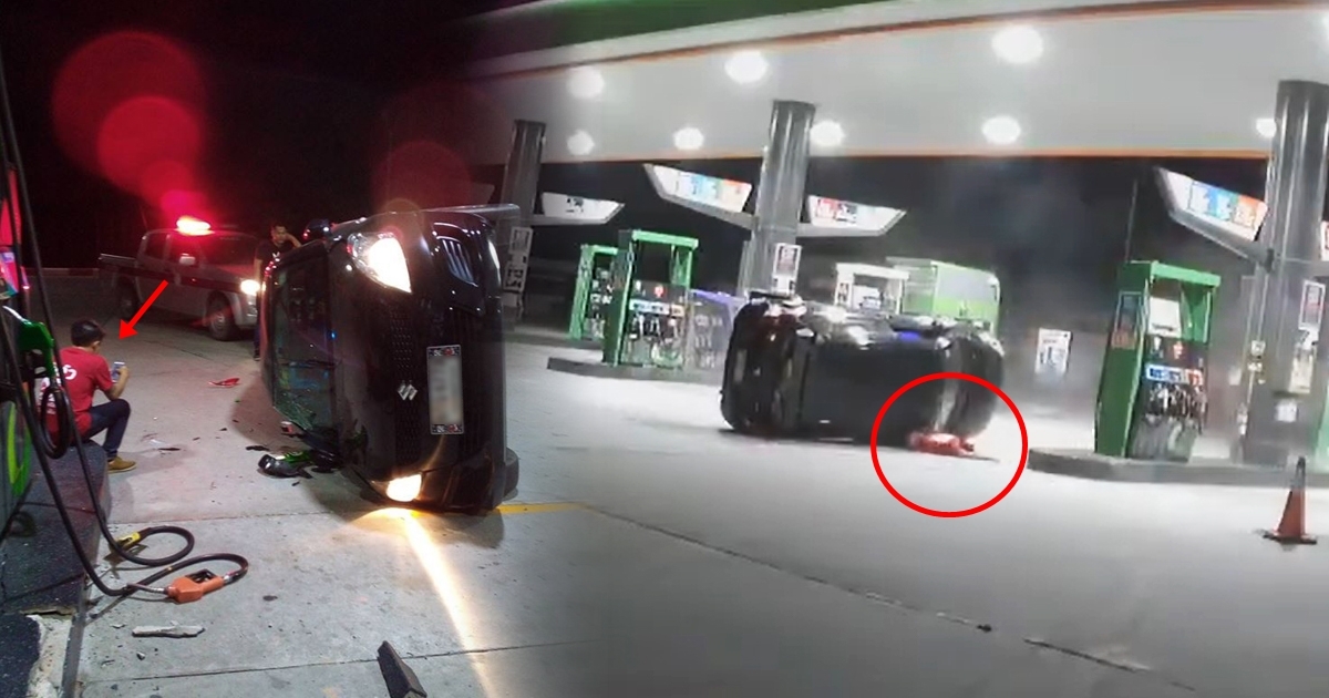 หนุ่มเผยนาทีรอดตาย ซิ่งเก๋งแหกโค้งหมุนเข้าปั๊ม ชนหัวจ่ายน้ำมัน จนหวิดระเบิด