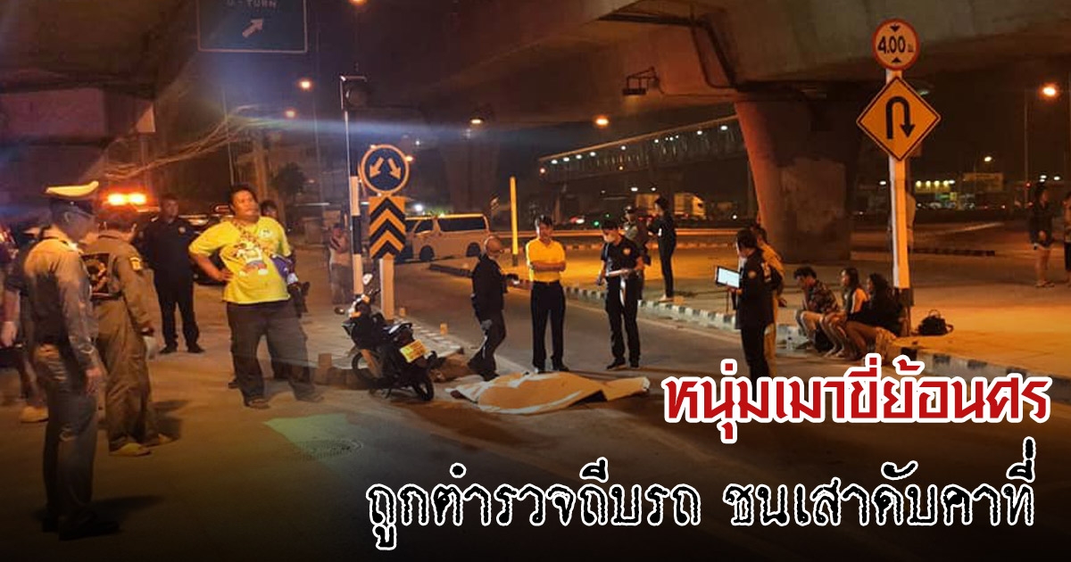 หนุ่มเมาขี่ย้อนศร เจอด่านรีบกลับรถหนี ถูกตำรวจดักถีบ ทำเสียหลักชนเสา ดับคาที่