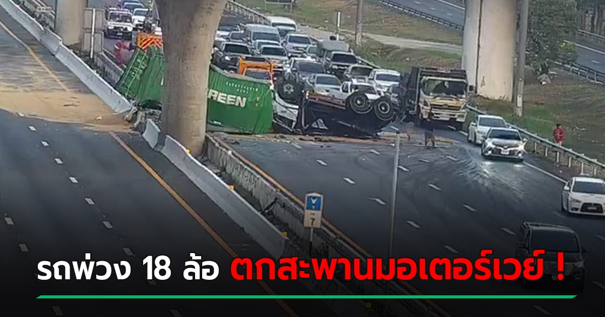 รถพ่วง 18 ล้อ ตกสะพานสูง 7 เมตร หลังฝ่าฝืนขึ้นสะพานห้ามรถบรรทุกขึ้น คนขับดับคาที่