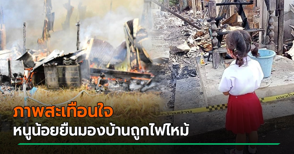 ภาพบีบหัวใจ.. หนูน้อยยืนมองบ้านถูกไฟไหม้เหลือแต่ซาก เหลือแค่ชุดนักเรียนติดตัว