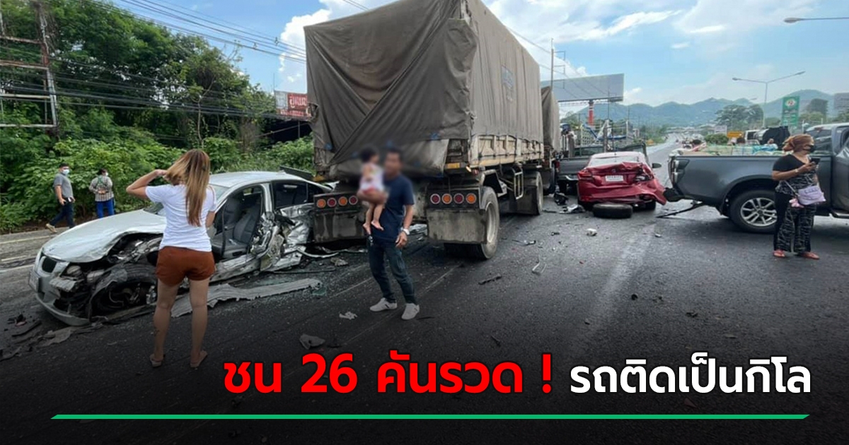 รถพ่วงเบรกแตก ชนไม่ยั้ง 26 คันรวด พังยับกลางถนนมิตรภาพ ทำรถติดยาวเป็นกิโล