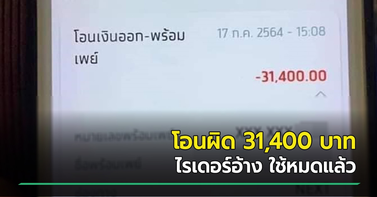 ยายโอนเงินผิด ให้ไรเดอร์ดัง จาก 314 เป็น 31,400 ทวงคืนไม่ให้ อ้างใช้หมดแล้ว