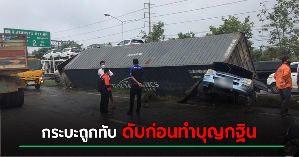 สลดก่อนทำบุญกฐิน กระบะจอดเสียริมทาง เจอเทรลเลอร์ชน พลิกทับ ดับ 2 เจ็บ 3