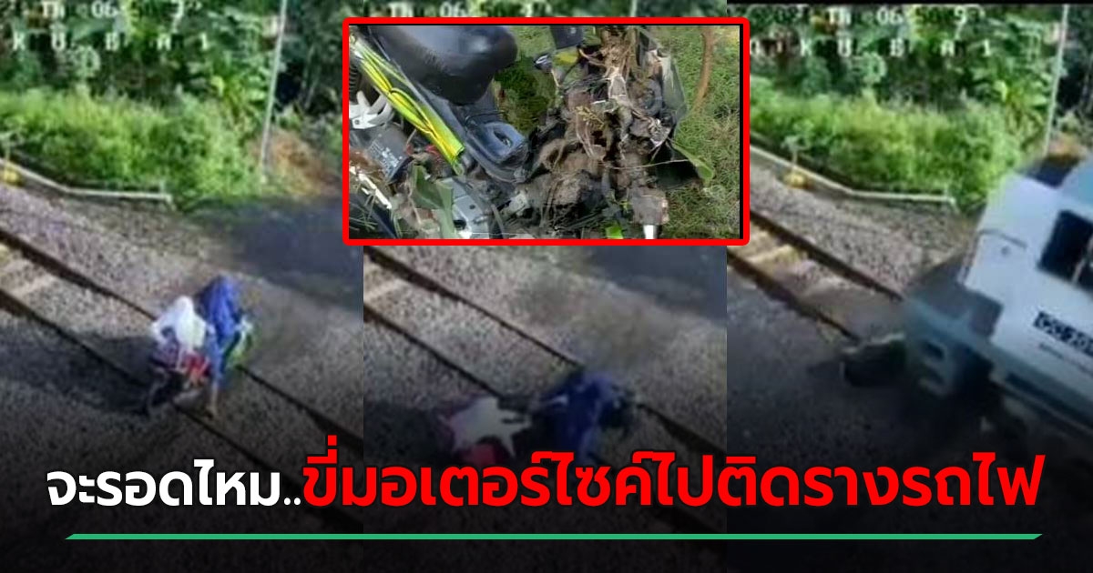 นาทีแม่ลูกขี่ จยย. ซ้อน 3 ติดคารางรถไฟ วิ่งหนีตาย จำใจปล่อยรถไฟวิ่งทับรถ