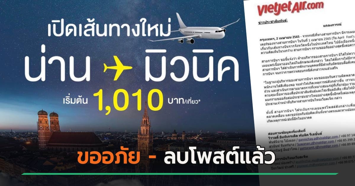 ไทยเวียตเจ็ท แถลงการณ์ หลังเล่นมุก น่าน-มิวนิก April Fool's Day จนทัวร์ลง