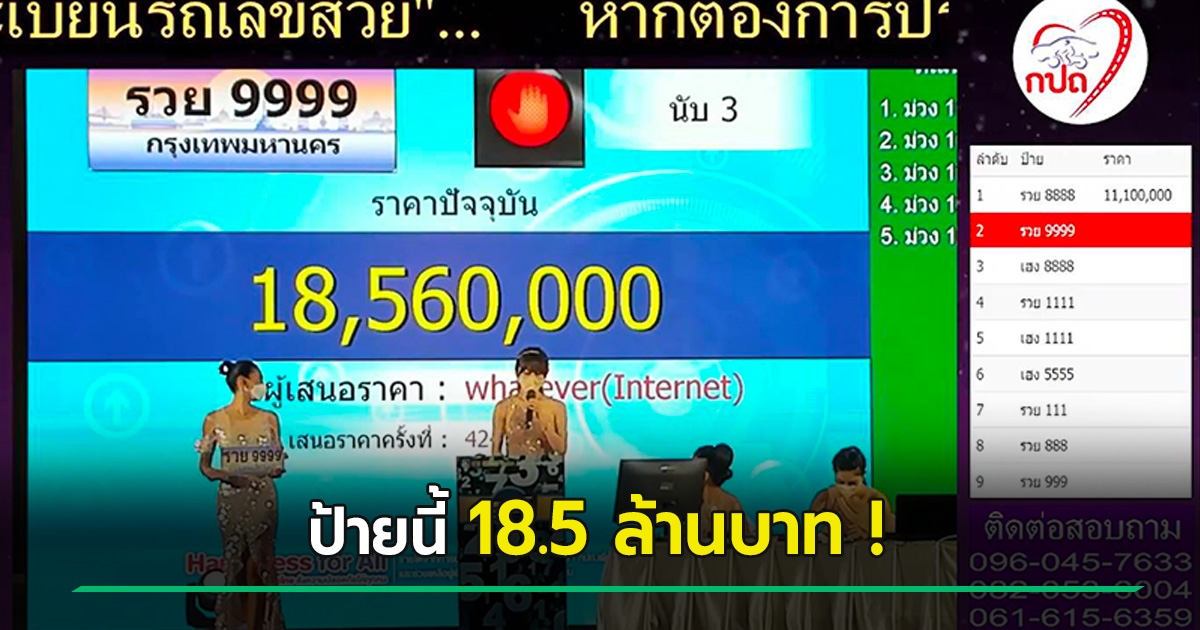 รวยของจริง ! ประมูลทะเบียนรถเลขสวย รวย 9999 ปิดจ๊อบ 45 นาที 18.5 ล้านบาท