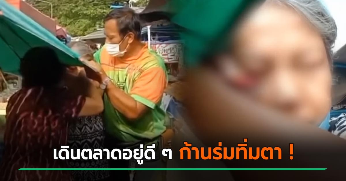 ช็อกทั้งตลาด ! ป้าเดินซื้อของเจอลมแรง พัดร่มร้านค้าล้ม ก้านเหล็กปักเสียบเบ้าตา