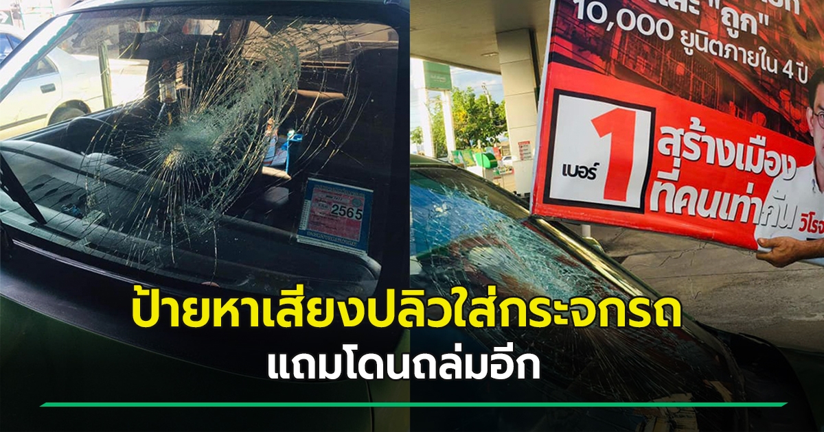 เสียวไส้... ป้ายหาเสียง ปลิวโดนกระจกหน้ารถหวิดทะลุ แถมโดนถล่มยับ จนต้องขอแจง