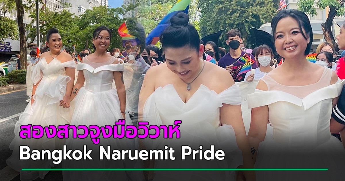 สุดอบอุ่น.. คู่รัก LGBTQ สวมชุดเจ้าสาว จูงมือจัดงานวิวาห์กลางงานนฤมิตไพรด์ 2022
