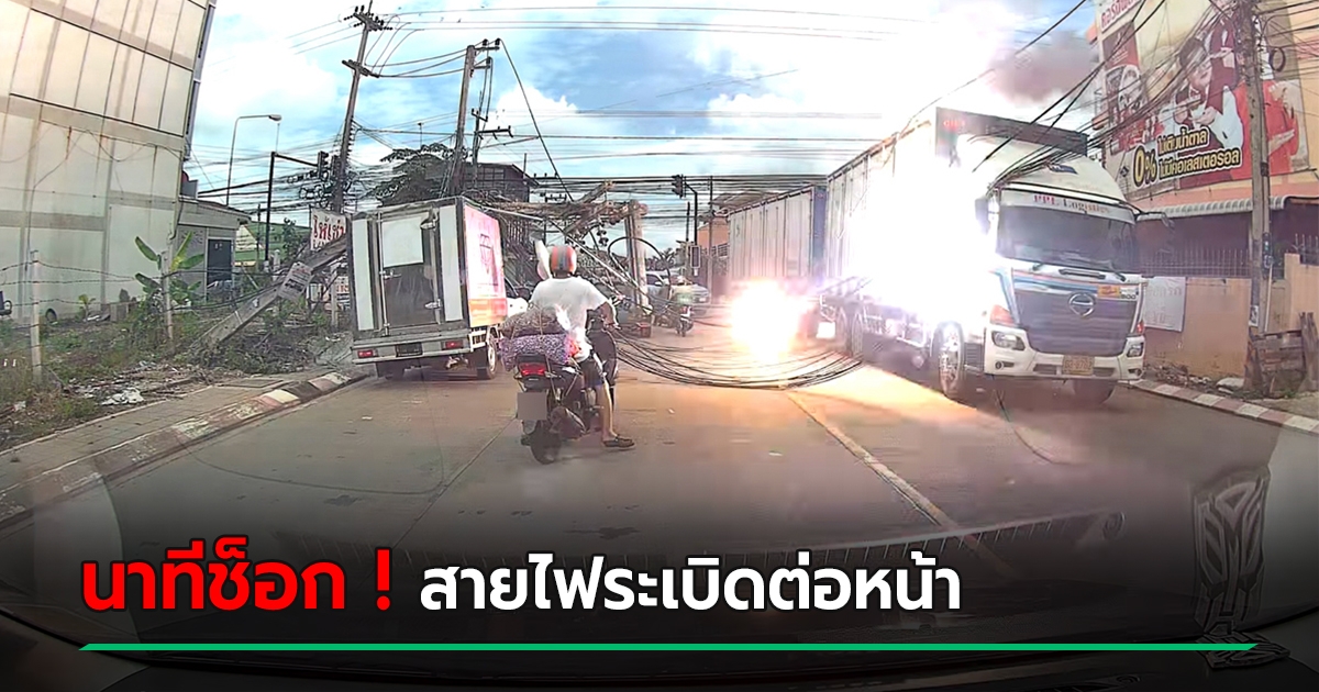ไวรัลระทึก รถพ่วงเกี่ยวสายไฟ จนเสาหักลงมา กระบะตู้ทึบเอาตัวเข้าไปรับ หนีตายอลหม่าน