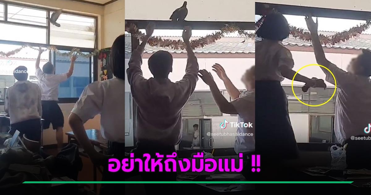 ตัวแม่จะแคร์เพื่อ ! นกบินเข้าห้อง 2 นร. ชายไล่จับไม่ได้สักที เพื่อนหญิงลั่น กูทำเอง !!