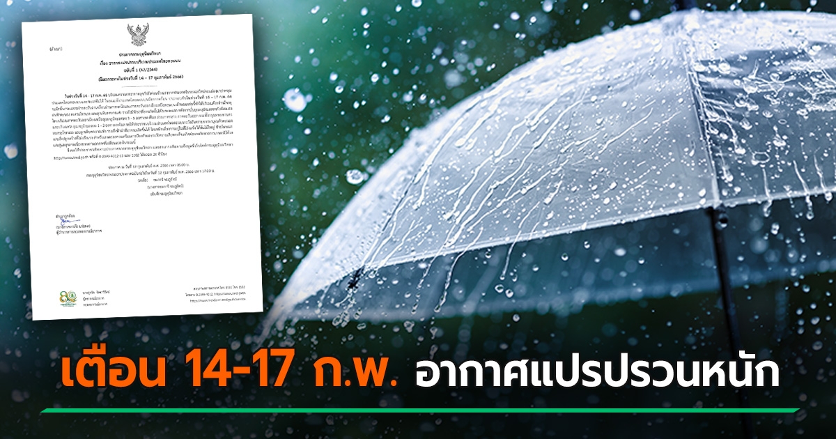 ฝนถล่ม ! กรมอุตุฯ เตือน 14-17 ก.พ. อากาศแปรปรวน อุณหภูมิลด 3-5 องศา