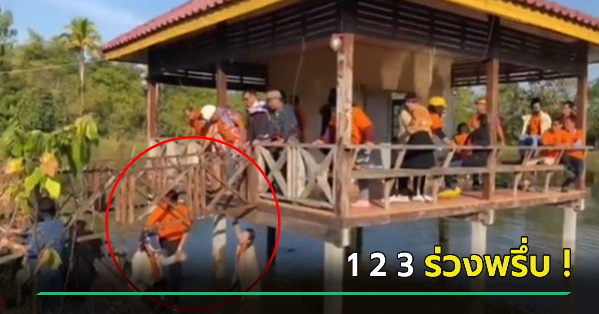 คลิปช็อตฟีล ถ่ายรูปหมู่ศาลาริมน้ำ สะพานหักโครมคนร่วงลงน้ำ แทนที่จะรีบขึ้นทำแบบนี้แทน