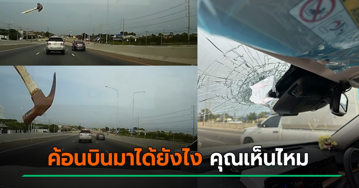 ขับรถอยู่ดี ๆ เจอค้อนบินปริศนาพุ่งชนกระจกแตก ย้อนดูคลิปอีกที ช่วยเพ่งหน่อยมาจากไหน