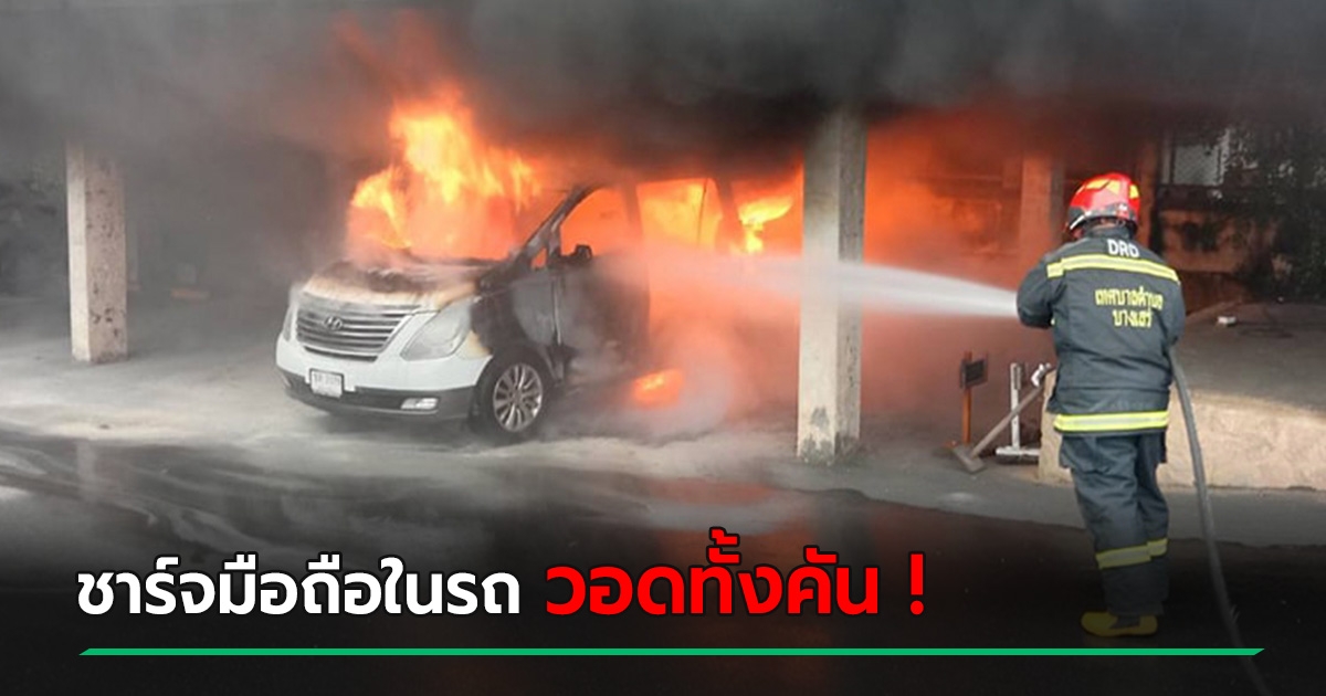 เข่าแทบทรุด ! ชาร์จแบตฯ มือถือทิ้งไว้ในรถยนต์ ไฟลุกพรึบวอดทั้งคัน
