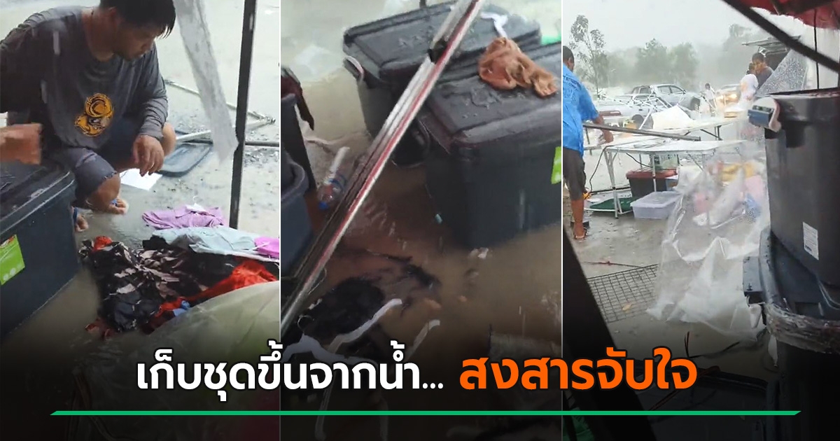 พ่อค้าเสื้อผ้าสุดท้อ ขายที่ตลาดนัดเจอพายุฝนถล่มร้าน เศร้าเก็บชุดเปียกจากพื้น