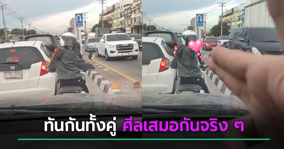ศีลเสมอกัน ! เมื่อคู่รักเจอกันตอนรถติด หันมาทักทายแบบนี้ รู้เลยทำไมเป็นแฟนกันได้