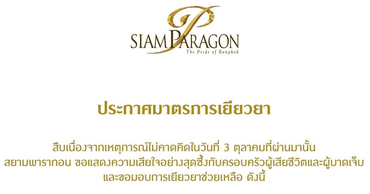 สยามพารกอน ประกาศเยียวยาผู้เสียชีวิตรายละ 5 ล้าน - ผู้บาดเจ็บรายละ 3 แสน พร้อมแสดงความเสียใจอย่างสุดซึ้ง