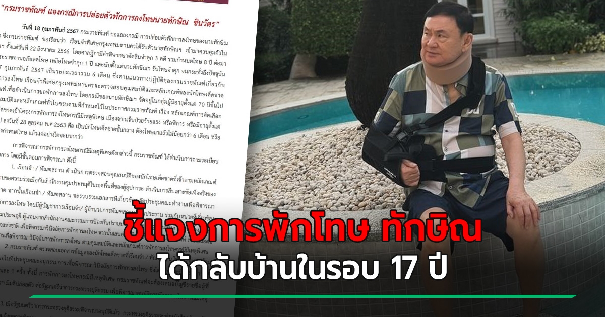 กรมราชทัณฑ์ แจง 3 ข้อ พักโทษกรณีมีเหตุพิเศษ ปล่อยตัวทักษิณ ชินวัตร