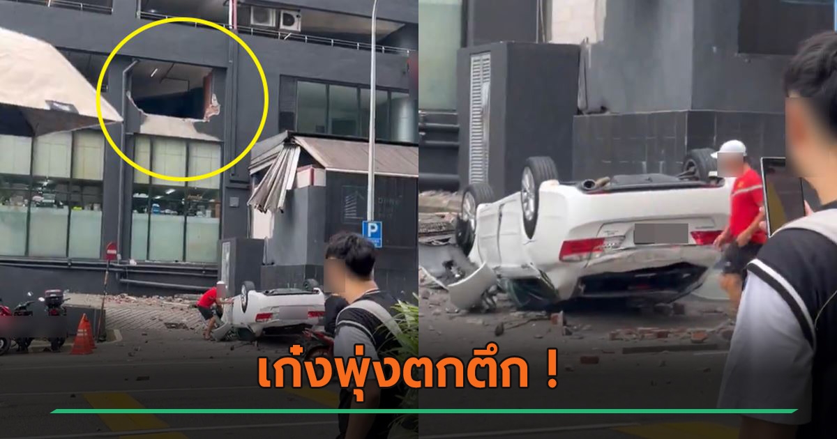ระทึก ! สาวขับเก๋งพุ่งทะลุกำแพง ร่วงตกตึก หงายท้องหลังคายุบ คนขับรอดปาฏิหาริย์