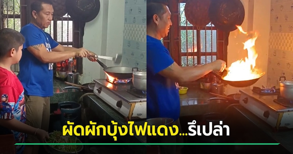ไวรัล 5 ล้าน ผัดผักบุ้งไฟแดงในตำนาน เมื่อพ่อสอนลูกทำ โยนเข้าไปไฟพุ่งทันที เป็นเมนูใหม่