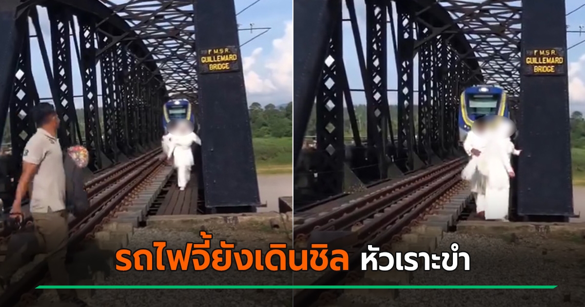 ดราม่า ! บ่าวสาวถ่ายพรีเวดดิ้งบนสะพานรถไฟ เจอบีบแตรไล่-รถไฟประชิด ยังเดินขำ