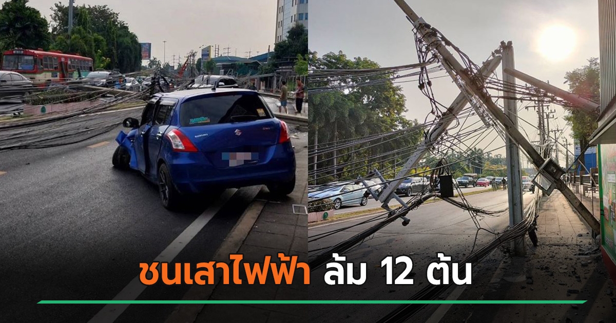 ระทึก ! เก๋งชนเสาไฟฟ้า เหนี่ยวเสาไฟล้ม 12 ต้น โค่นทับรถอีก 2 คัน - เจ็บ 1 ราย