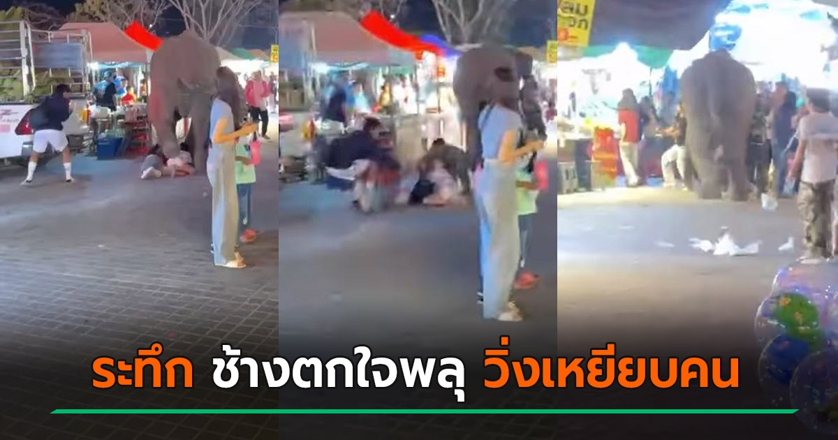 นาทีผวา ช้างตกใจเสียงพลุงานกาชาด วิ่งเตลิดทั้งชนทั้งเหยียบคนเที่ยวงาน เจ็บ 5 ราย