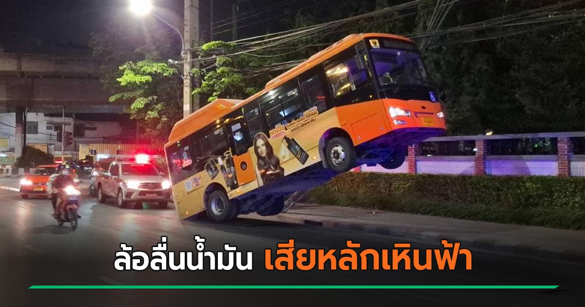 รถเมล์ ปอ. 167 ลื่นคราบน้ำมัน เสียหลักเสย ปีนสลิงยึดเสาไฟ ล้อยกติดแหง็ก