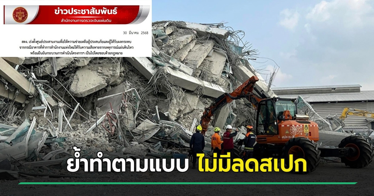 สตง. แจงสร้างตึกถูกต้อง ทำตามแบบ-ไม่มีลดสเปก ย้ำโปร่งใส ตรวจสอบได้