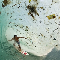 นักเล่นเซิร์ฟโต้คลื่นกลางวงล้อมขยะ ที่เกาะชวา