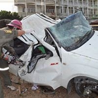 รถกระบะซิ่งแข่งกัน ก่อนเสียหลักชนเกาะกลาง ดับคาที่