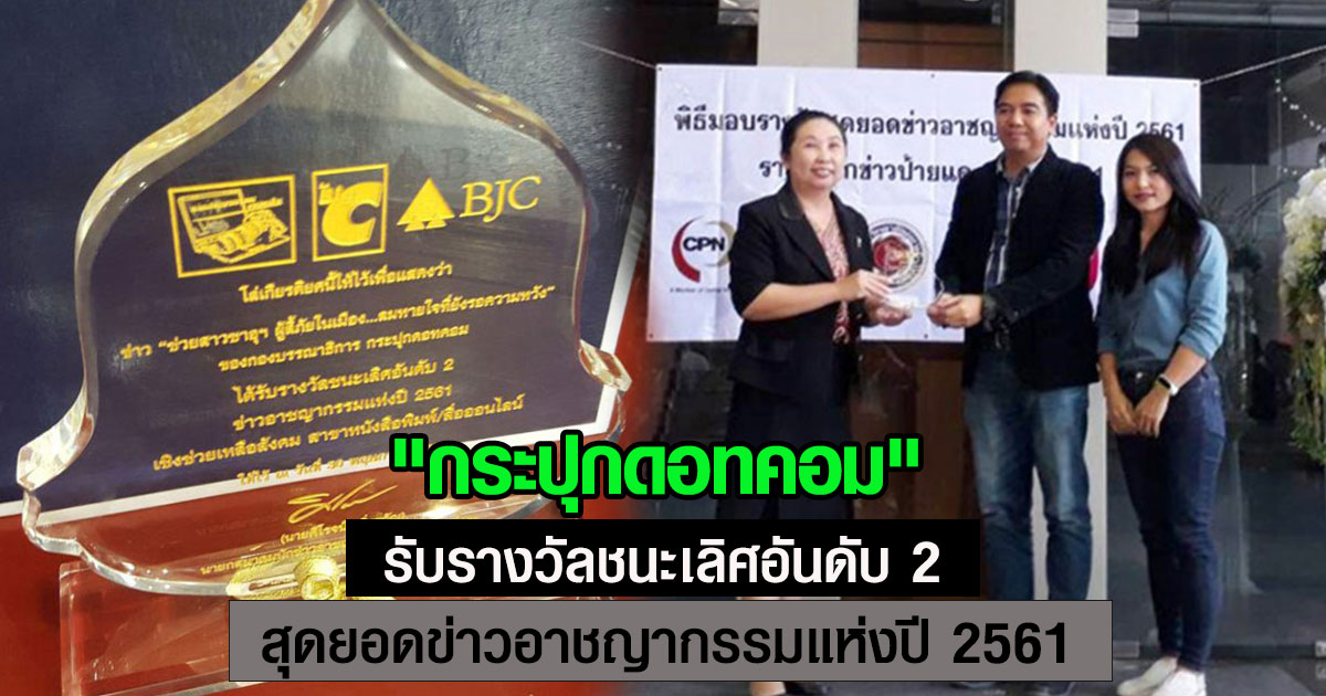 "กระปุกดอทคอม" เข้ารับรางวัลชนะเลิศอันดับ 2 สุดยอดข่าวอาชญากรรมแห่งปี ประจำปี 2561 จากสารคดีเชิงข่าวช่วยสาวซาอุฯ เมื่อวันที่ 28 กันยายน 2562 ดร.พรชัย มงคลวนิช อธิการบดีมหาวิทยาลัยสยาม เป็นประธานในพิธีมอบรางวัลสุดยอดข่าวอาชญากรรมแห่งปี 2561 รางวัลนักข่าวป้ายแดงแห่งปี 2561 พร้อมด้วยอาจารย์วรนันทน์ ชัชวาลทิพากร ศิลปินแห่งชาติ สาขาทัศนศิลป์ ที่มหาวิทยาลัยสยาม ถนนเพชรเกษม กทม. ซึ่งทางกองบรรณาธิการ กระปุกดอทคอม คว้ารางวัลชนะเลิศอันดับ 2 ประเภทข่าวช่วยเหลือสังคม สาขาหนังสือพิมพ์/สื่อออนไลน์ ซึ่งสารคดีนี้เป็นสารคดีข่าวช่วยสาวซาอุฯ (ผู้ลี้ภัยในเมือง ลมหายใจที่ยังรอความหวัง) ทั้ง 2 ตอน ขณะที่บรรยากาศภายในงานเต็มไปด้วยรอยยิ้ม โดยมีสื่อมวลชนจากหลายสำนักเข้ารับรางวัล และร่วมแสดงความยินดี โดยในปีนี้ทางสมาคมนักข่าวอาชญากรรมแห่งประเทศไทย ได้ให้รางวัลสุดยอดข่าวอาชญากรรมแห่งปี 2561 รางวัลนักข่าวป้ายแดงแห่งปี 2561 สาขาโทรทัศน์ ประเภทข่าวสืบสวนสอบสวน รางวัลชนะเลิศอันดับ 1 ข่าวถูกสวมคดีที่พิมาย ของช่อง 9 รางวัลชนะเลิศอันดับ 2 ข่าวมูลนิธิแอบอ้างเบื้องสูง ของไทยพีบีเอส รางวัลชนะเลิศอันดับ 3 ข่าวปมทุจริตเงินคนจน ของช่อง 8 รางวัลชมเชย ได้แก่ ข่าวข่มขืนที่เกาะแรด และข่าวเอื้อประโยชน์ล้มคดี ของช่อง 8 สาขาโทรทัศน์ ประเภทข่าวช่วยเหลือสังคม รางวัลชนะเลิศอันดับ 1 ข่าวตำรวจยัดยา ของช่อง TNN 16 รางวัลชนะเลิศอันดับ 2 ข่าวทะเบียนสมรสอำพราง ของช่อง 9 รางวัลชนะเลิศอันดับ 3 ข่าวหลอกเช่ารถ ของไทยพีบีเอส สาขาหนังสือพิมพ์/สื่อออนไลน์ ประเภทข่าวช่วยเหลือสังคม รางวัลชนะเลิศอันดับ 1 ข่าวเปิดโปงโกงเงินคนจน ของกองบรรณาธิการ หนังสือพิมพ์ไทยรัฐ รางวัลชนะเลิศอันดับ 2 ข่าวช่วยสาวซาอุฯ ผู้ลี้ภัยในเมือง…ลมหายใจที่ยังรอความหวัง ของกองบรรณาธิการ กระปุกดอทคอม ประเภทข่าวสืบสวนสอบสวน รางวัลชนะเลิศอันดับ 1 ข่าวตำรวจโกงตำรวจ ของกองบรรณาธิการ หนังสือพิมพ์เดลินิวส์ รางวัลชนะเลิศอันดับ 2 ข่าวทลายแอพฯลามก ของกองบรรณาธิการ มติชนออนไลน์ รางวัลชมเชย ได้แก่ ข่าวอันตรายสุขภาพ ฟ้องศาลปกครอง และข่าวหมู่บ้านหรูรุกป่าสงวน ของช่อง 9 รางวัลเสื้อสามารถ ประกอบด้วย ข่าวร่างทรงหลอกชาวบ้าน ของช่อง 9 ข่าวทุจริตสมาคมฌาปนกิจ และข่าวพิษศัลยกรรม ของไทยพีบีเอส (ผลงานของ นายประภาส เลิศวิไล และ น.ส.วรรณิษา ศรีรื่น ผสข. รายการสถานีประชาชน)
