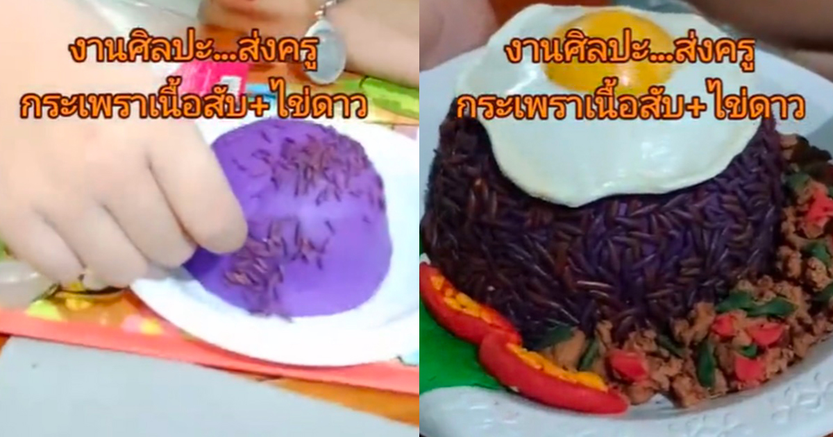 หนุ่มน้อยทำงานศิลปะส่งครู ปั้นดินน้ำมันเป็นข้าวกะเพราไข่ดาว