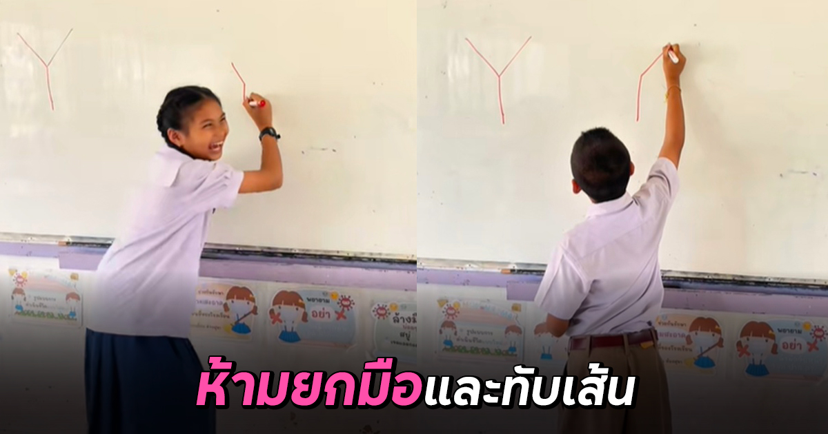 นักเรียนเขียนตัวอักษร Y แบบห้ามทับเส้นและยกมือ คนสุดท้ายพีคสุด