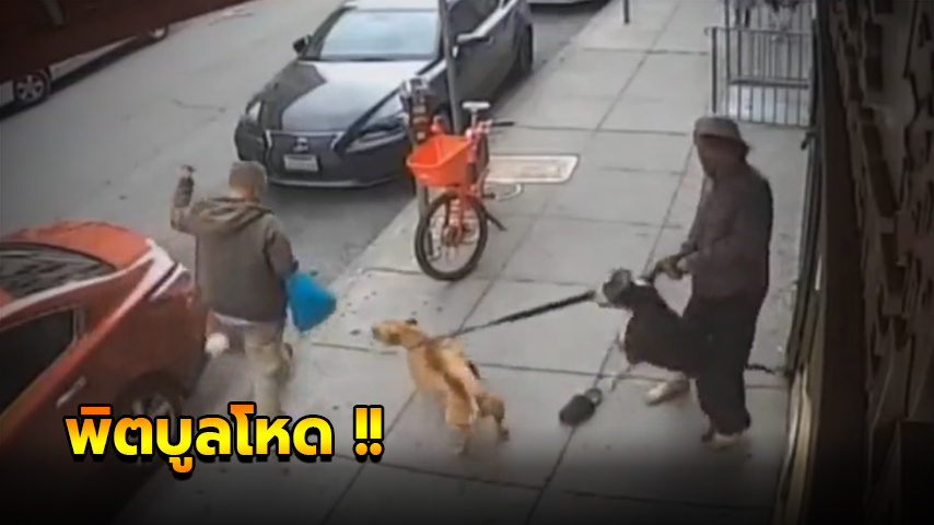 กล้องวงจรปิดจับภาพ เจ้าของสุนัขพาพิตบูล 2 ตัวออกมาเดินเล่น แต่ควบคุมไม่หยู่ เจอคนจูงสุนัขพันธุ์เล็กเดินสวน พุ่งใส่จนสายจูงหลุดรุมขย้ำกัดไม่ปล่อย เจ้าของต้องช่วยกันแยกอย่างยากลำบาก สำหรับสุนัขพันธุ์เล็กที่โดนกัดเกือบตาย