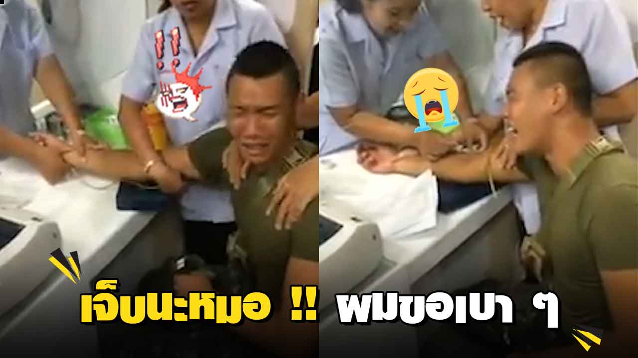 โอ๊ย... ทหารก็เจ็บเป็น !! ผู้ใช้เฟซบุ๊กชื่อว่า ทรงศรี ชื่นอิ่ม ได้โพสต์คลิปสุดน่าสงสารของทหารคนหนึ่ง พี่ทหารคนนี้ถึงจะดูแข็งแรงบึกบึน แต่ใครจะรู้พี่เขากลัวเข็มฉีดยามาก ๆ ร้องเสียงหลง ทำเอาชาวโซเชียลต่างมาคอมเมนต์เอ็นดูท่านคนนี้เป็นจำนวนมาก เหตุการณ์เป็นอย่างไรไปชม