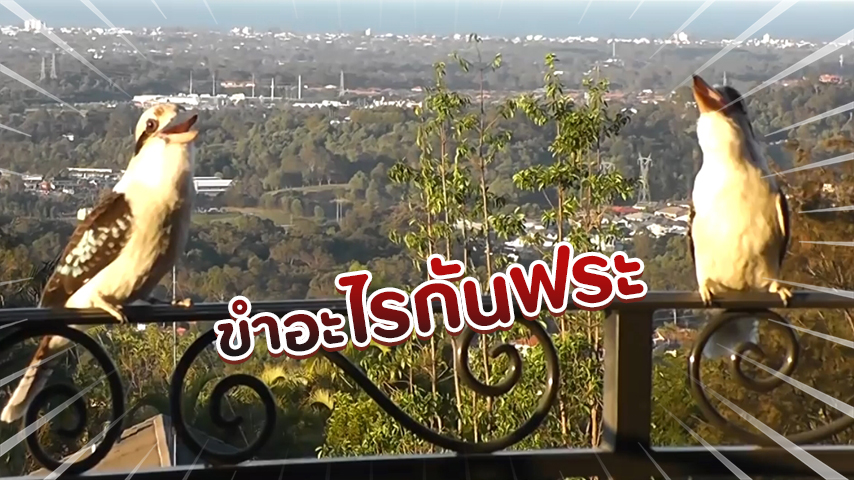 คลิปเผยให้เห็น นกคุกคาบาร่า 2 ตัว เกาะรั้วหัวเราะกันดัวยเสียงดังสนั่นหวั่นไหว โดยมีนกพันธุ์อื่นเกาะอยู่ใกล้ ๆ มองด้วยสายตาแบบ อิหยังวะ ราวกับว่าไม่เก็ตมุก