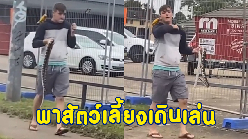 ที่มันทำให้เธอต้องชะงักอ้าปากค้างและหยิบโทรศัพท์ขึ้นมาถ่ายคลิปโดยเร็วก็เพราะว่า สัตว์ที่หนุ่มคนนี้พามาเดินเล่นนั้น เป็นนกแก้วสีเหลืองเกาะไหล่มานิ่ง ๆ 1 ตัว ส่วนอีกตัวเป็นงูถือมาในมืออย่างชิล แถมยังดูเหมือนว่าฟังเพลง เต้นโยกตัวไปมาอย่างอารมณ์ดี