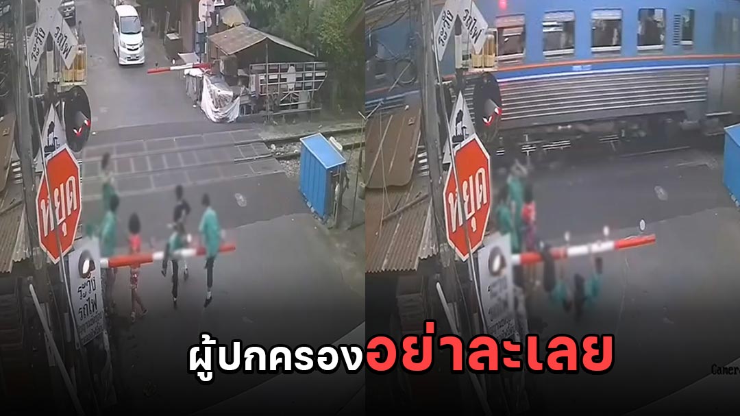 กลุ่มเด็ก ๆ พากันออกมาโหนไม้กั้นรถไฟเล่น ขณะทีไม้กั้นกำลังทำงานและรถไฟกำลังมา ซึ่งเป็นการกระทำที่อันตรายมาก ผู้ปกครองควรตักเตือนเด็ก ๆ อย่าปล่อยปะละเลย