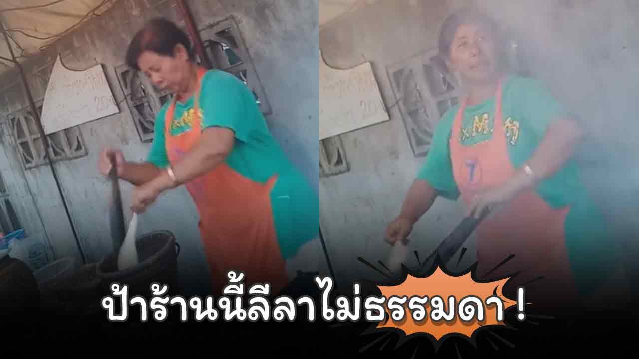 โดยคุณป้าใช้มือขวาจับสากตำส้มตำในครก ส่วนมือซ้ายใช้ทัพพีคลุกเคล้าส้มตำ พร้อมกับโยกตัวกระเด้งตัวอย่างสุดมันส์เหมือนกับว่าได้ออกกำลังกายแต่หน้าคุณป้ายังนิ่ง ตำ ๆ โยก ๆ แต่หน้านิ่งชอตนี้สุดพีค ทำเอาชาวเน็ตแห่คอมเมนต์เพียบ อย่าบอกเด้อว่าเต้นทุกครก, ฮาตอนถามข้าวเหนียวแม่นบ่คะ, ตำที่แขน ปวดที่ขา