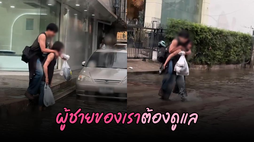 ผู้ใช้ TikTok @jubji.b โพสต์คลิปโมเมนต์น่ารักดูไปยิ้มไป นี่คือแฟนสาวที่แข็งแกร่งแห่งปี แฟนหนุ่มของเธอดูเหมือนว่ารองเท้าจะเปียกน้ำไม่ได้ แฟนสาวเลยให้ขี่หลังเดินลุยฝ่าน้ำท่วม