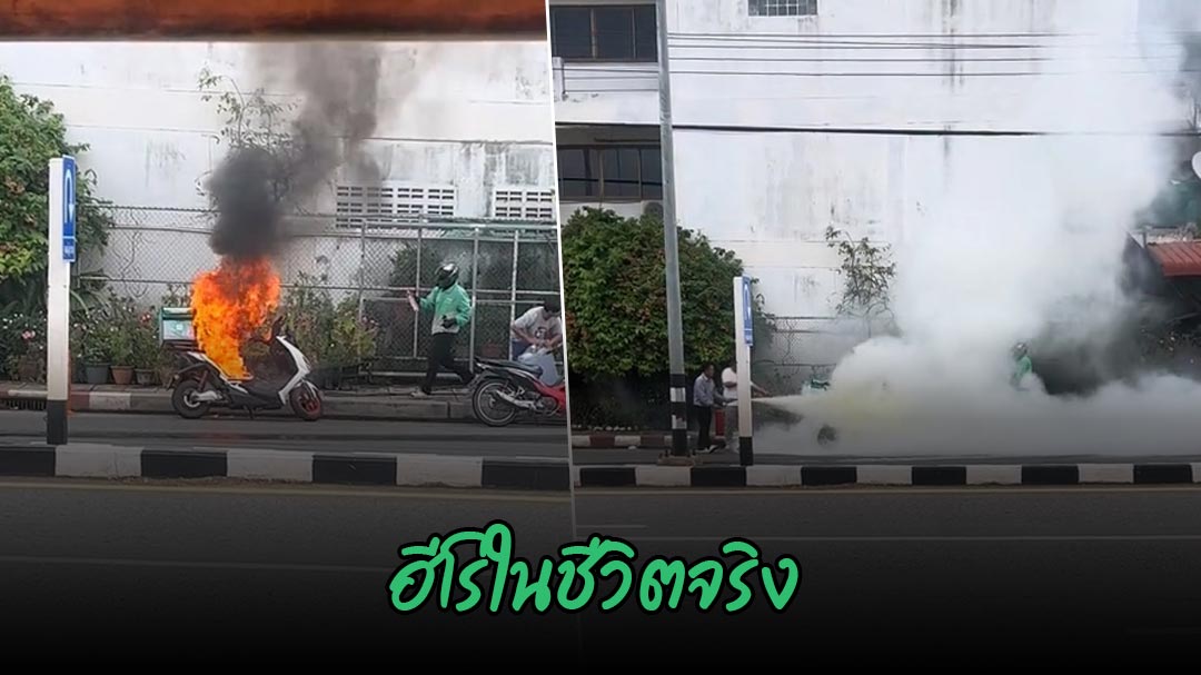 ผู้ใช้ TikTok @ppppppp45628 โพสต์คลิปเหตุการณ์สุดระทึกเมื่อรถมอเตอร์ไซค์ไรเดอร์ส่งอาหารเกิดไฟลุกไหม้ พลเมืองดีเห็นเหตุการณ์ไม่รอช้า คว้าถังดับเพลิงเข้าช่วยดับไฟอย่างรวดเร็ว ช่วยกันอย่างเต็มที่จนควบคุมสถานการณ์ได้ทันก่อนลุกลามหนัก