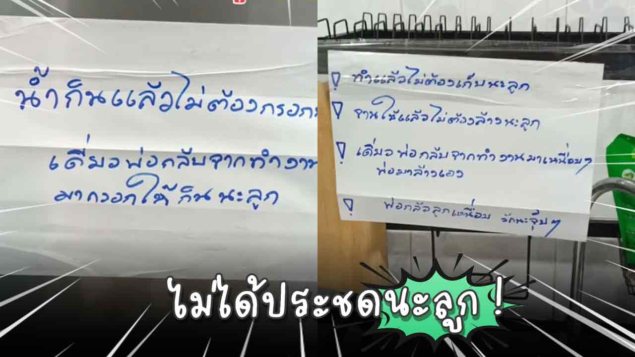 กลายเป็นคลิปไวรัลสุดฮาบน TikTok จากผู้ใช้ @namoilchoojit0 ที่เผยให้เห็นมุมประชดเบา ๆ แต่เต็มไปด้วยความรักของคุณพ่อคนหนึ่ง ที่เขียนโน้ตติดทั่วบ้าน ทั้งหน้าตู้เย็น อ่างล้างจาน และจุดอื่น ๆ ด้วยข้อความแนว “รักลูกแบบเหนื่อย ๆ” เช่น