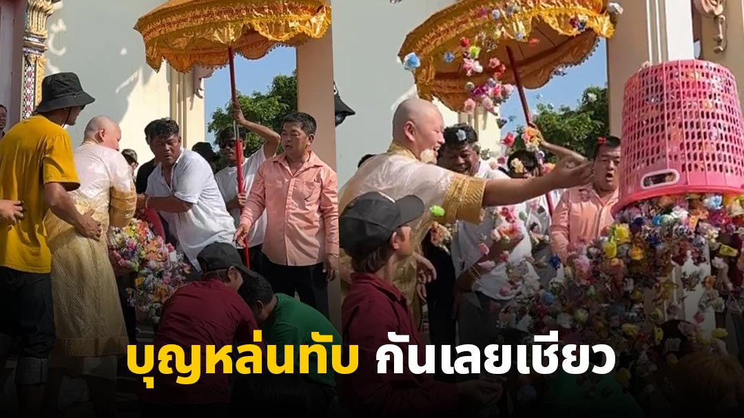 ผู้ใช้ TikTok @andyj7260 โพสต์คลิปจังหวะนาคหนุ่มโปรยทานในงานบวช เจ้าตัวกะจะสาดเหรียญโปรยทานไปให้ไกล ๆ แต่ตะกร้าเหรียญโปรยทานดันหลุดมือ คนที่อยู่ด้านหน้าเลยได้บุญแบบหล่นทับไปเต็ม ๆ