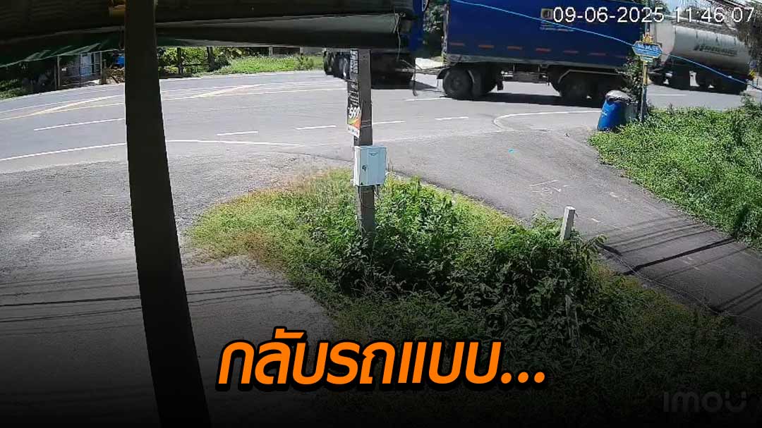 ภาพกล้องวงจรปิดนาทีอุบัติเหตุรถบรรทุกพ่วงชนกันเอง เหตุจากรถบรรทุกคันแรกกลับรถไม่ทันระวัง อีกคันทางตรงเบรกไม่ทันชนกันสนั่นจนพลิกคว่ำ