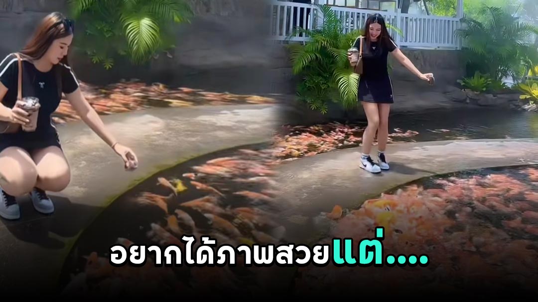 ผู้ใช้ TikTok @fonfon202542_ ลงคลิปกำลังจะให้อาหารปลาคาร์พที่คาเฟ่แห่งหนึ่งในบางแสน จ.ชลบุรี เพื่ออยากถ่ายรูปเก็บชอตสวย ๆ แต่ทว่าดูเหมือนปลาคาร์พในบ่อจะให้ความร่วมมือมากไปหน่อย ปลาบางตัวถึงกับลอยขึ้นบกมาเลยทีเดียว พากันรุมแย่งอาหาร จนเธอวิ่งหลบแทบไม่ทัน จากที่อยากได้รูปสวย กลับกลายเป็นได้ความฮาแทน