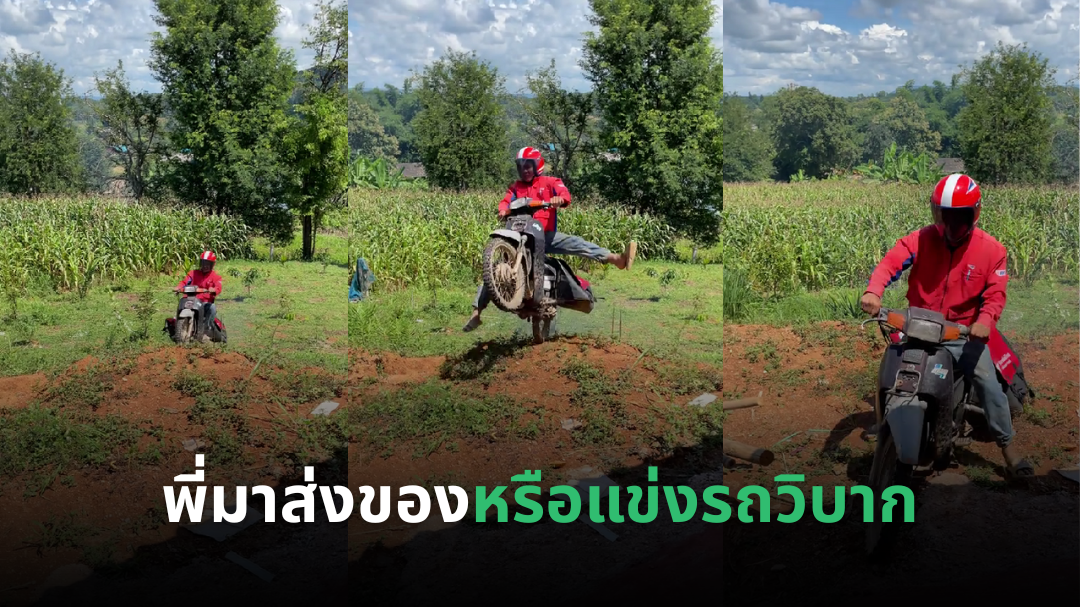 ผู้ใช้ TikTok @thananop30 โพสต์คลิปขณะไปรษณีย์ไทย ขี่รถมาส่งพัสดุที่ อ.พาน จ.เชียงราย ส่งด่วน ส่งไวของแทร่ ยกล้อขึ้นเนินอย่างกับกำลังแข่งรถวิบาก บอกเลยว่าแม้ทางจะลำบากแค่ไหน แต่พี่ไปรษณีย์คนนี้ก็ไปถึง !