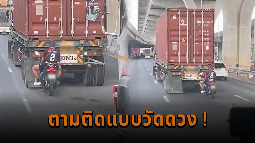 บัญชี X @RedSkullxxx โพสต์คลิปพฤติกรรมขี่รถหวาดเสียวและอันตราย ลุงขี่มอเตอร์ไซค์จี้ท้ายรถบรรทุก ตามติดไม่มีเว้นระยะห่าง ทำไมถึงขี่รถแบบนั้น อยากวัดดวงหรืออย่างไร ? พฤติกรรมแบบนี้เสี่ยงเกิดอุบัติเหตุ อย่าหาทำ !