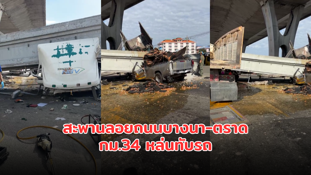วันที่ 18 ธ.ค. 2568 ช่วงเวลาประมาณ 9 โมงเช้าที่ผ่านมา เกิดอุบัติเหตุสะพานลอยถนนบางนา-ตราด กม.34 หล่นทับรถ ยังมีคนติดอยู่ในรถเทรลเลอร์ ยังปลอดภัยดี มูลนิธิร่วมกตัญญูเร่งส่งทีมกู้ชีพกู้ภัยนำอุปกรณ์ไปช่วยชีวิต - ส่วนรถขนไข่พบผู้เสียชีวิต สาเหตุรายงานเบื้องต้นเกิดจากคานสะพานลอยโดนดัมพ์ฟาด ก่อนหล่นลงมา